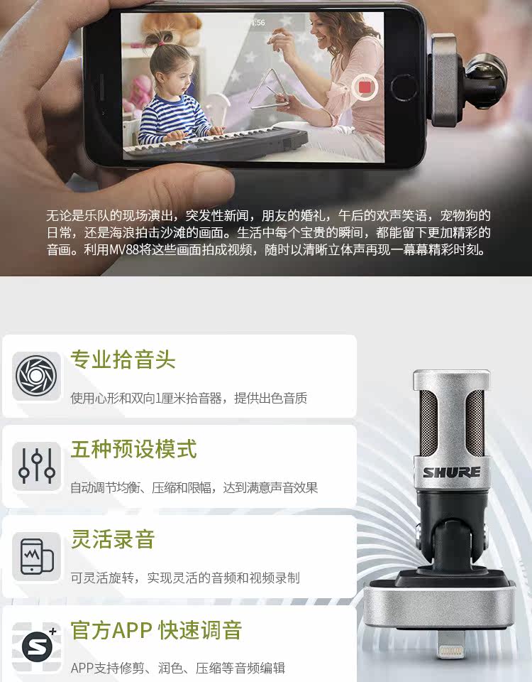 Shure/舒尔 mv88 iOS手机电容话筒/麦克风唱歌吧K歌专用苹果七/8x